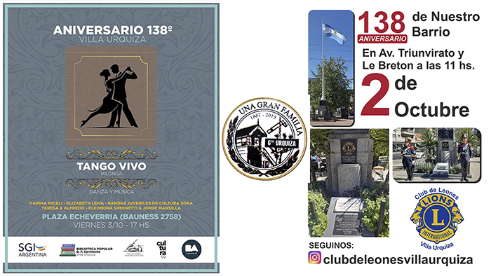 Con motivo de conmemorar el 138º Aniversario de Villa Urquiza, el Club de Leones organiza un evento en la plazoleta de Le Breton y Bauness mientras que el Área de Cultura de la Comuna 12 organiza un evento en la Plaza Echeverria.