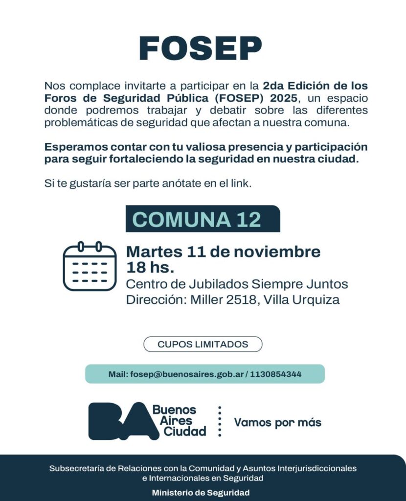 Se invita a los vecinos de la Comuna 12 al Foro de Seguridad Pública para tratar entre todos aquellos problemas que les interesa.